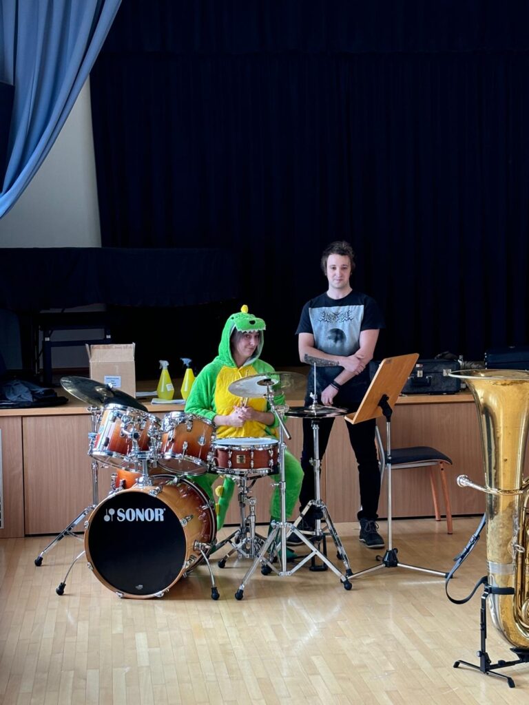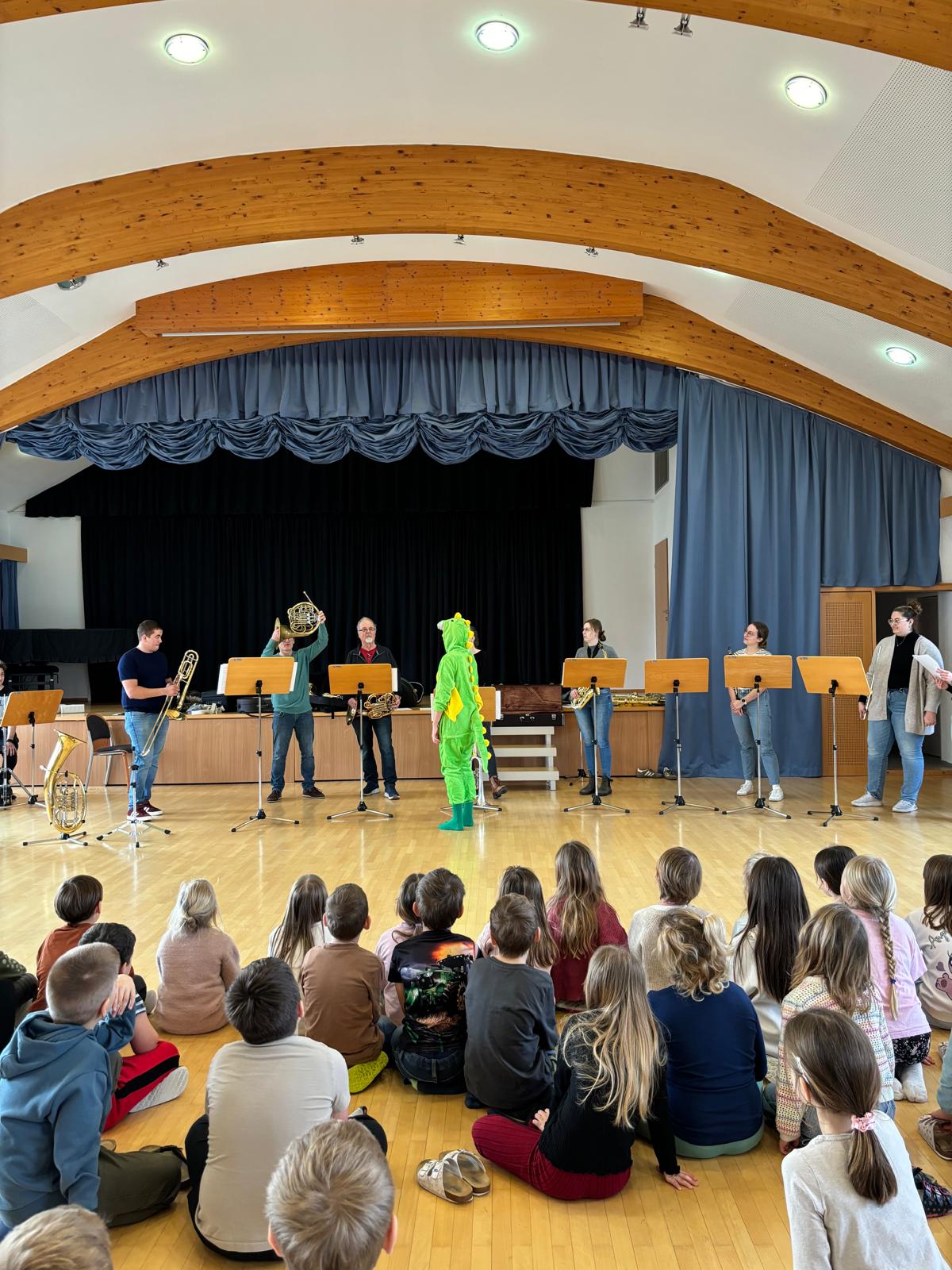 Am Freitag besuchte der Musikverein Prambachkirchen unsere Schule und stellte den Kindern seine Instrumente vor. Mit dabei war auch Drache Greenhorn, der neugierig auf der Suche nach einem Instrument war, das er lernen kann.