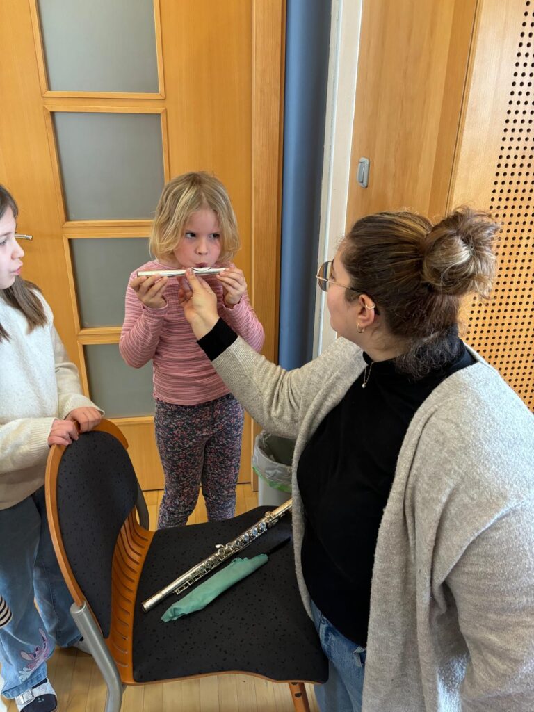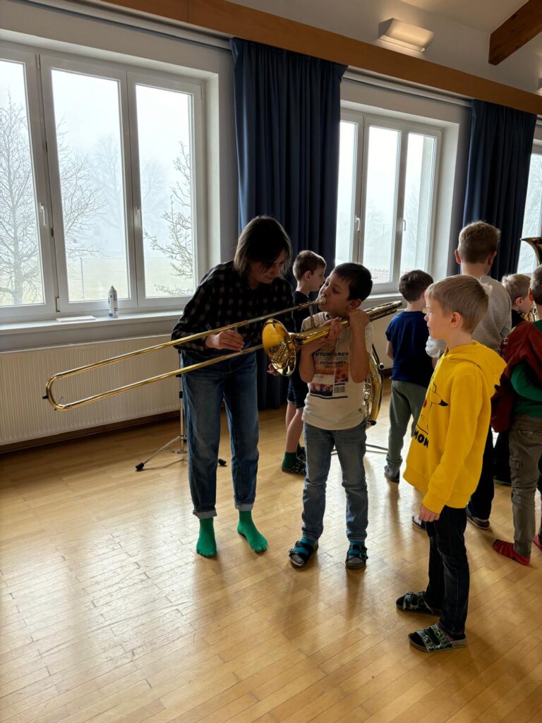 Zum Abschluss wurde es richtig spannend: Die Kinder durften die Instrumente selbst ausprobieren. Alle waren mit voller Begeisterung dabei! Vielleicht hat Drache Greenhorn – und auch das eine oder andere Kind – jetzt sein Lieblingsinstrument gefunden!